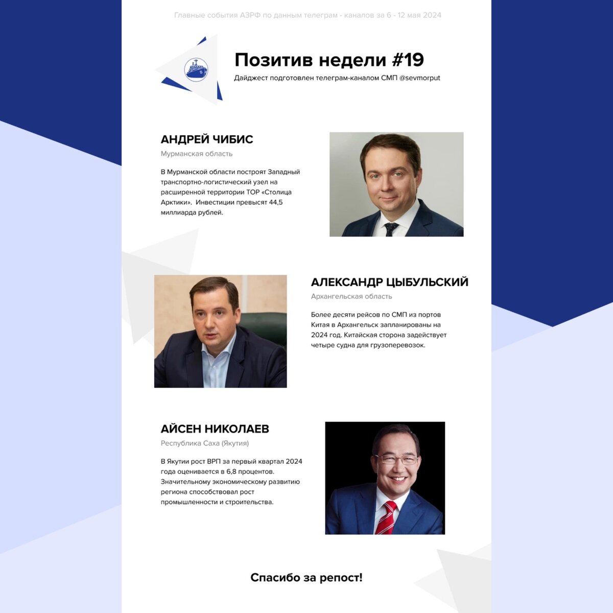 Представляем еженедельный рейтинг «Главы АЗРФ — Позитив недели. Неделя 19» Андрей Чибис В Мурманской области построят Западный транспортно-логистический узел на территории ТОР «Столица Арктики». Проект включает создание терминала и двух глубоководных причалов для перевалки грузов между контейнеровозами ледового и неледового класса, которые будут идти по Северному морскому пути. Объем инвестиций превысит 44,5 миллиарда рублей, и запуск объекта обеспечит работой более 700 человек. Этот проект направлен на развитие инфраструктуры и увеличение пропускной способности грузоперевозок в арктическом регионе. Александр Цыбульский В 2024 году из портов Китая в Архангельск запланировано более 10 рейсов по Северному морскому пути. Для этого будут задействованы четыре судна. Соглашение о сотрудничестве было подписано 8 мая губернатором Архангельской области и представителями компаний АМТП и «Торгмолл». Основная цель — развитие морских контейнерных перевозок и увеличение объема перевалки грузов. Мо