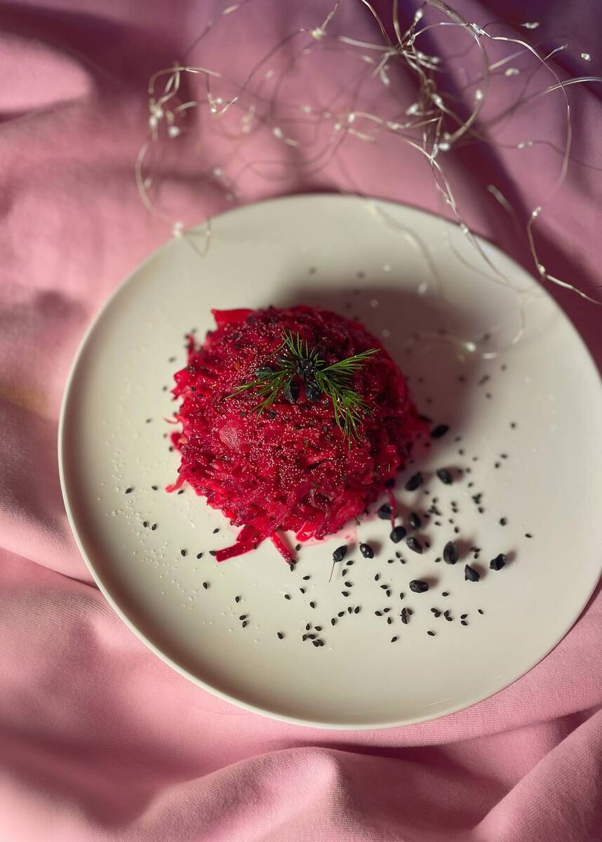 ✅ Соединить квашеную капусту с натертой свеклой и укропом, поперчить, посолить, заправить маслом. Перемешать.