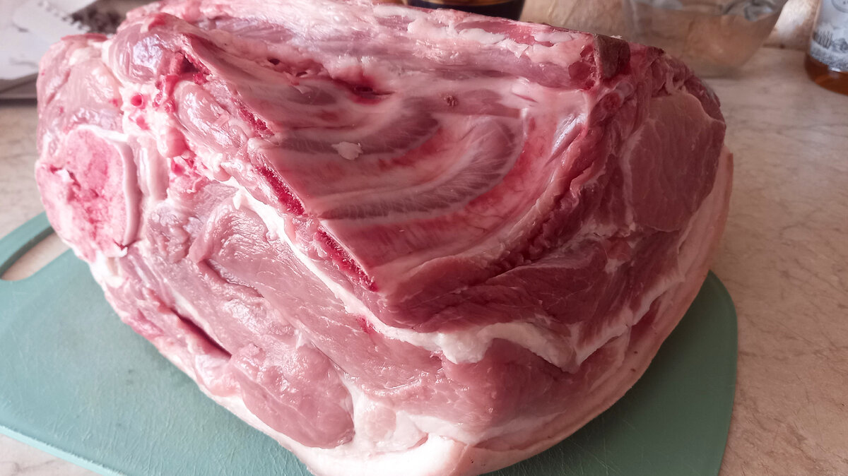 Вот такой симпатичный кусок фермерской свинины, совершенно наисвежайший, из-под ножа, продают за 280 р./кг. Здесь чуть больше 6 килограмм. Рёбра с мяском и сало мы закоптили. Ещё там была лопатка - это на один хороший бульон. Остальное - на кусочки и в морозилку. Из-за лопатки мякоти не так много вышло, пакетиков 8 по 400-500 грамм.
