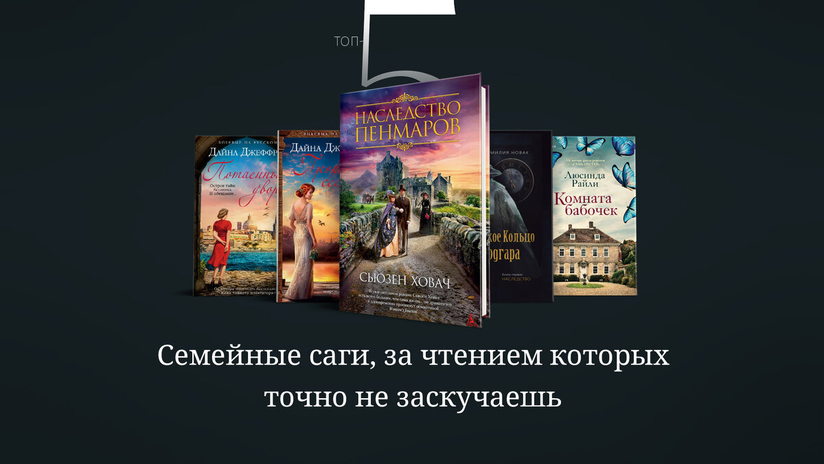 «Наследство Пенмаров» Ховач Сьюзен На утесах корнуолльского побережья высится старинный особняк, который скорее напоминает заброшенный склеп, чем родовое гнездо. Кто-то из многочисленного семейства Пенмар страстно, до одержимости, любит его, кто-то ненавидит всем сердцем, и у каждого есть на то свои причины. «Магическое кольцо Бродгара» Кейтлин Эмилии Новак Фэнтезийная сага о Мэган Мак-Кензи, наследнице замка в Шотландии. Погружаясь в мир древних традиций и мистических верований, она встречает друзей, противников и влюбляется в загадочного горца, Дерека. Открыв страшную тайну своего возлюбленного, Мэган сталкивается с выбором между комфортной жизнью в Лондоне и жизнью, полной опасностей, на севере Шотландии. Ее путь лежит через темные лабиринты судьбы, где ей предстоит играть в игру с жизнью и смертью. «Пропавшая сестра» Дайна Джеффрис В 1930-х годах начинающая певица Белл Хэттон приезжает в Бирму, где обнаруживает статью о пропаже своей новорожденной сестры Эльвиры. С помощью американ