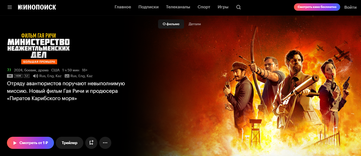 Новый боевик Гая Ричи “Министерство по делам, не связанным с джентльменством” появился в российском прокате и теперь доступен в "Кинопоиске". Фильм доступен в высоком разрешении 4K и HDR, а также имеет два варианта озвучки – от студии "Мосфильм Мастер" и "Кубик в кубе", рассчитанные на зрителей старше 18 лет. Для тех, кто предпочитает оригинальное звучание, есть возможность включить русские субтитры. Владельцы подписок на сервисы "Больше кино" или "Амедиатека" могут приобрести фильм за символическую сумму в 1 рубль без ограничений по количеству просмотров. Остальным покупка фильма обойдется в 499 рублей. Для ценителей качественной картинки и интересного сюжета этот фильм определенно будет достоин внимания. ]]>