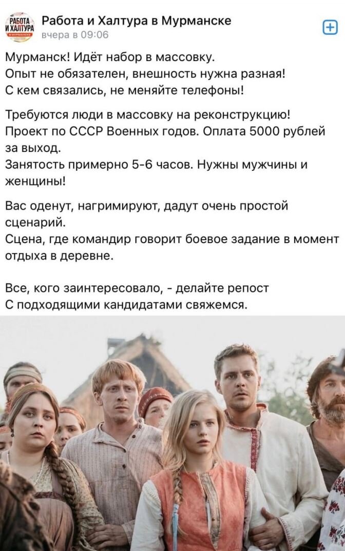 В соцсетях активизировались мошенники, которые предлагают жителям Мурманска принять участие в «съемках» некоего военного фильма. Авторы постов обещают потенциальным участникам массовки выгодные условия, в том числе высокую оплату труда.