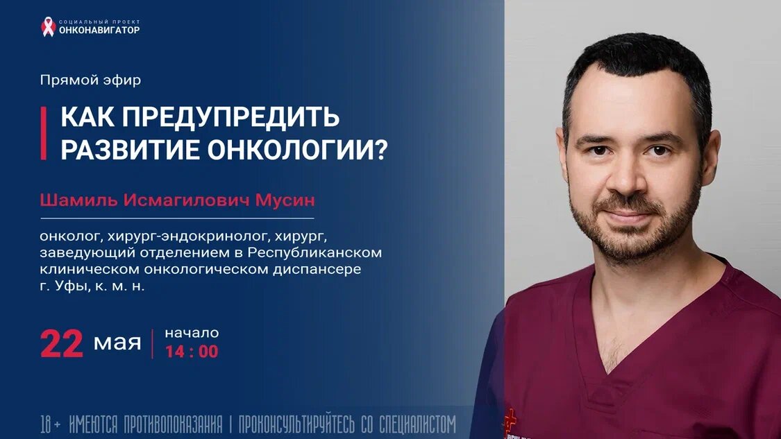 Социальный проект «Онконавигатор» и Everland продолжают серию прямых эфиров с врачами-онкологами, чтобы рассказать о мерах профилактики, первых симптомах, современных методах диагностики и лечения рака. Ждем вас 22 мая в 14:00 (по мск) на третьем эфире. Поговорим о том, как предупредить развитие онкологии. Наш гость Шамиль Исмагилович Мусин — онколог, хирург-эндокринолог, хирург, заведующий отделением в Республиканском клиническом онкологическом диспансере г. Уфы, к.м.н. расскажет: какие наиболее эффективные методы профилактики рака существуют сегодня, о симптомах, которые должны насторожить и рекомендациях по диагностике. Ссылка на эфир: https://youtube.com/live/I_z76dFWzd0?feature=share Если у вас есть вопросы к доктору по теме эфира, обязательно задавайте их в комментариях к этому посту! Мы ответим на них в прямом эфире.