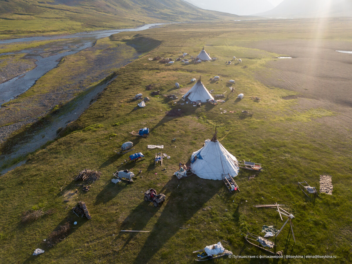 Эта семья оленеводов живёт в горах Полярного Урала. Круглый год они кочуют по тундре вместе со своим стадом в 2000 оленей. По сути вся их жизнь проходит среди болот, гор и речушек на родовых землях. Летом они двигаются на север к берегу Карского моря, совершая переходы по 10-20 км каждый день. Ну а зимой идут на юг и стараются останавливаться в относительной доступности от посёлков. В это стойбище я попала летом. Почти каждый год семья оленеводов в августе стоит на достаточно большой площадке у речки Хадата в окружении Уральских гор. Чуть меняется конкретное место стоянки, но локация плюс или минус одинаковая каждый год. На этом месте стоят несколько недель. Потому что оно относительно удобное: тут есть река с чистой водой, много еды для оленей. При этом, в 70 км по тундре есть фактория (по сути магазин для оленеводов в тундре) и при желании за сутки можно доехать до посёлка. Плюс, летом тут периодически бывают туристы. А самое главное — вездеходчики, которые возят этих туристов и мо