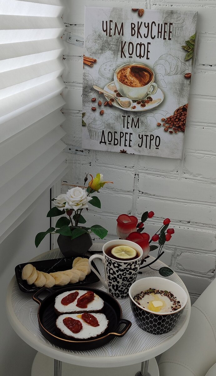 Каша овсяная с маслом и смесью семян, тосты с чесноком, греческим сыром и вялеными помидорами, банан, чай с лимоном и сахзамом.