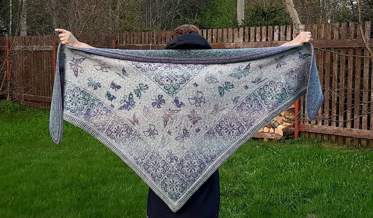 Но сюрприз преподнесла Дундага , неожиданно обесцветив самые светлые секции . Самые красивые - бирюза и сирень - практически потеряли свою окраску. Можно , конечно , сказать , что такое обесцвечивание сделало шаль более нежной , но я бы сказала , что бабочки от этого потеряли .