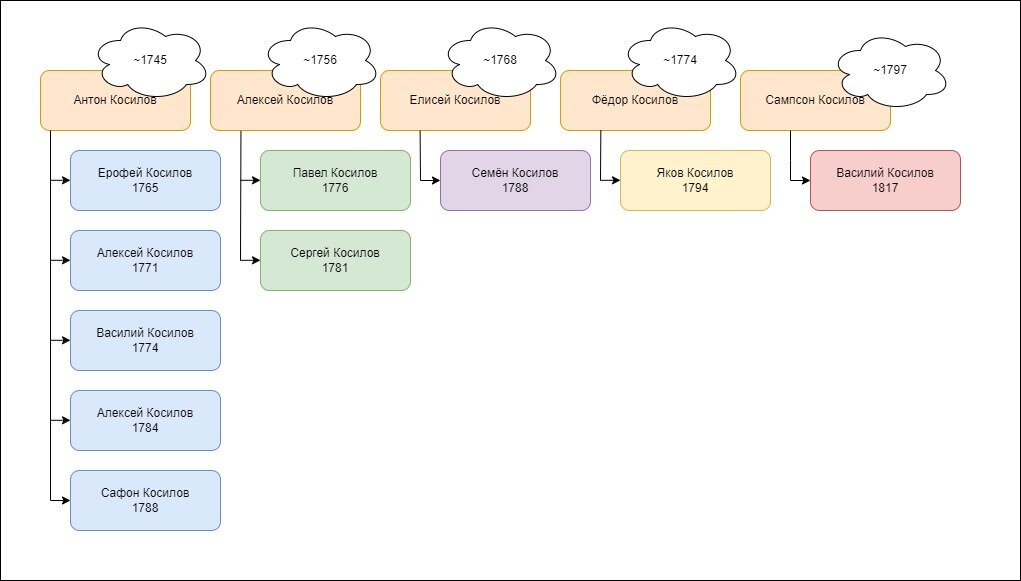 Антон Косилов, год рождения около 1750 года, к 1835 уже умер. От него можно построить корень дерева, который объединяет почти половину семей Косиловых.