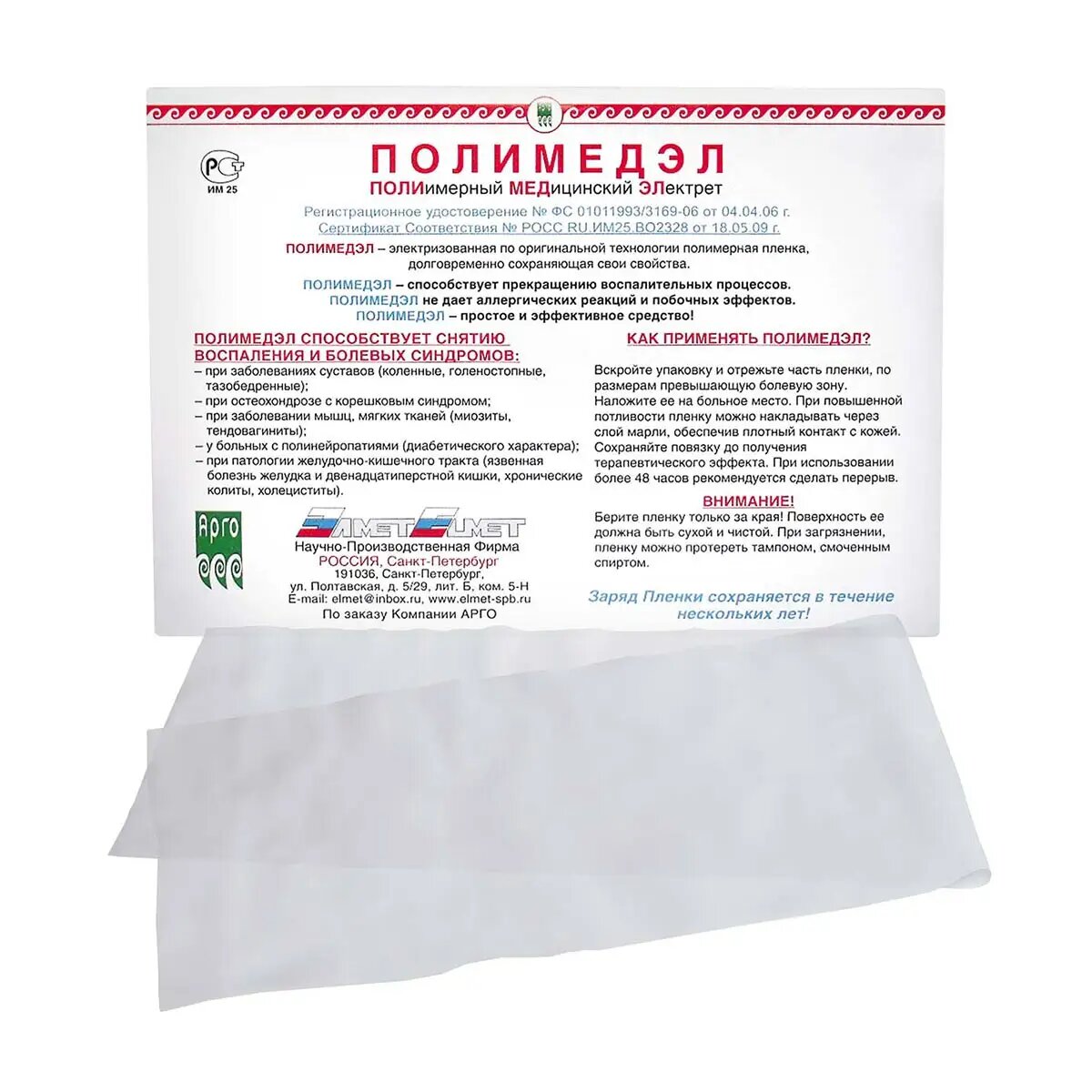 Полимедэл - это полимерная медицинская пленка из медицинского фторопласта F4a (9х29 см, толщина 10-50 микрон), в которую по специальной технологии внедрен нормированный электрический заряд большой плотности, порядка 10 кулон на один квадратный сантиметр. Особая технология обработки пленки коронным зарядом при температуре 200°С.