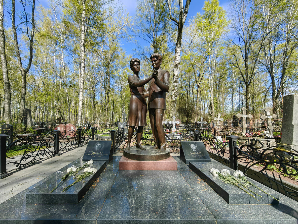 Во время прогулки 9 мая по Киновеескому кладбищу мне повстречался красивый памятник, который изображает танцующую пару мужчины и женщины. Я решил поискать в интернете информацию о скульптуре. Раз такой масштаб значит люди должны быть известные. И скульптор, наверное, тоже. Оказалось, что на этом участке находится фамильное захоронение русских немцев Миллеров. Центральное захоронение родителей председателя Газпрома Алексея Миллера украшено скульптурой танцующей пары. Миллер Людмила Александровна (1936 - 2009). Миллер Борис Васильевич (1935 - 1986) Работали они в НИИ электроники Министерства авиационной промышленности СССР, который впоследствии был переименован в НПО «Ленинец». Людмила Александровна трудилась в должности инженера, а Борис Васильевич работал слесарем-сборщиком. В интернете пишут, что автор скульптуры Зураб Церетели. Хотя точной информации я нигде не нашёл. Может быть вы знаете? Кстати говоря, сейчас смотрел видео и увидел, что внизу на пьедестале написано имя автора.