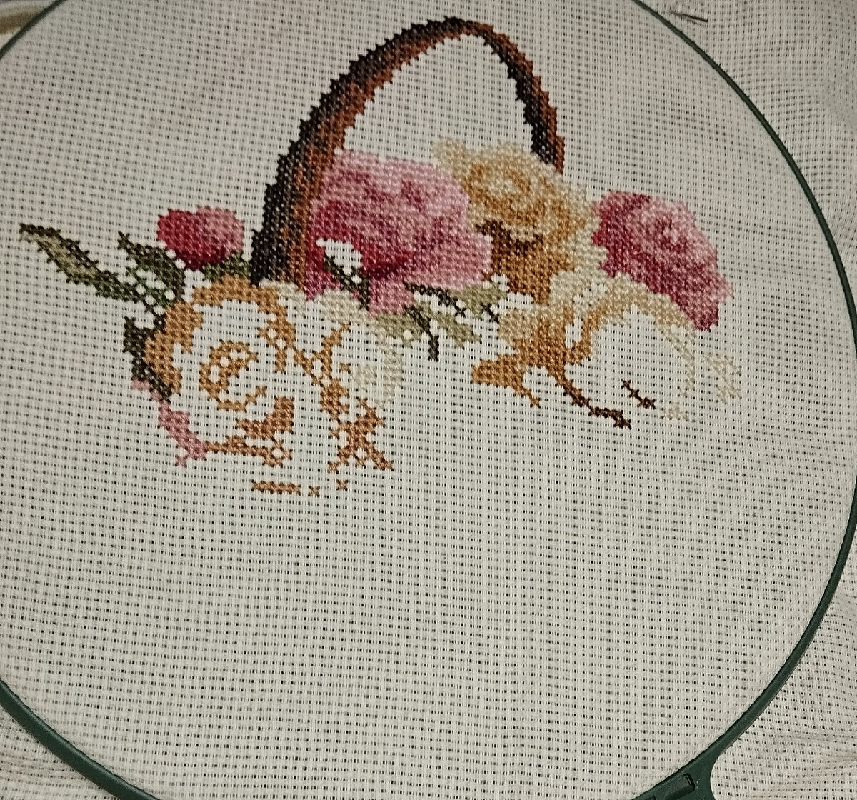 После вышивки ярких ягод на салфетке захотелось вышивать нежными оттенками цветов. Начала корзину с розовыми и чайными розами.