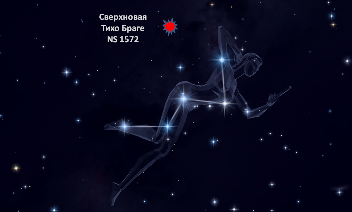 Тихо Браге очень точно измерил экваториальные координаты необыкновенной звезды, и мы теперь с уверенностью можем указать ту точку созвездия Кассиопеи, где когда-то она сияла.