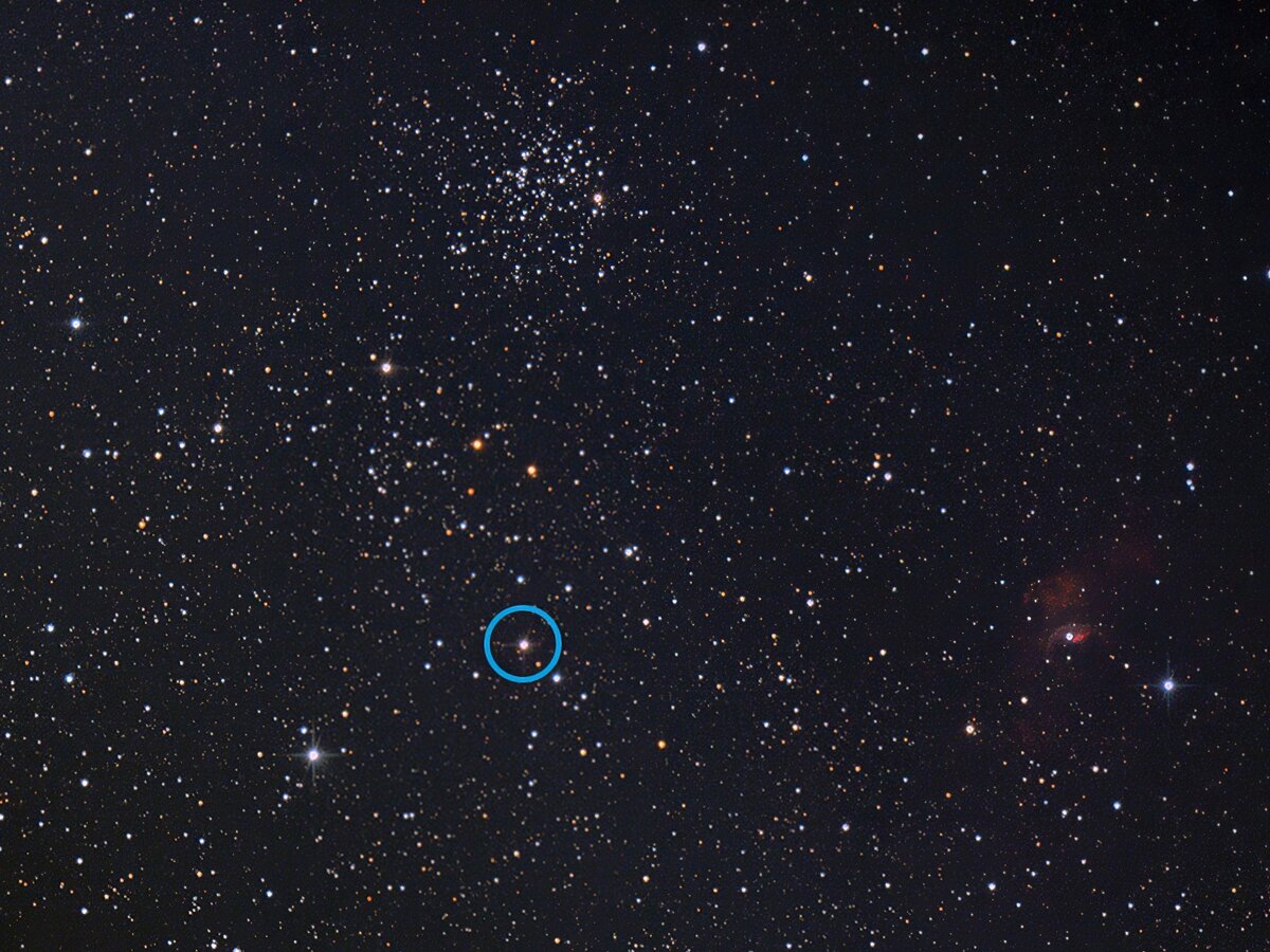 Звезда ρ Кассиопеи (ро Кассиопеи). Жёлтый гипергигант. Слабая для невооружённого глаза точка, недалеко от β (бетта) Кассиопеи.