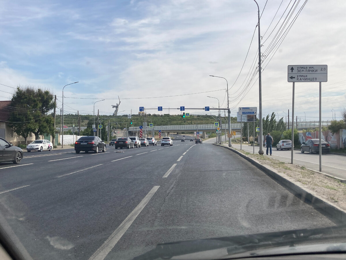 Всё. Еду не по делам, а с чувством, с толком, с расстановкой. Сначала через половину Волгограда и на танцующий мост. Сейчас направо поверну. И почему-то всегда так тепло у меня на сердце, когда Родина-Мать меня и провожает, и встречает: