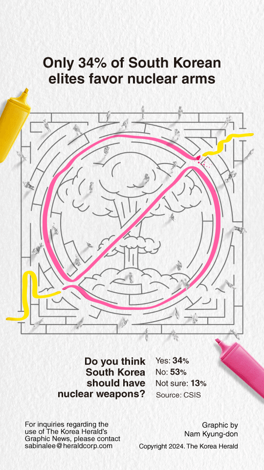 Выяснилось, что только 34 процента представителей элиты ответили «да» на вопрос о том, должна ли Южная Корея иметь ядерное оружие, в то время как 53 процента ответили «нет», а 13 процентов «не уверены».