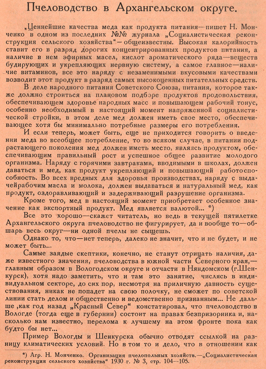 Публикую с целью сохранить документ, так как сайт - исходник, где этот документ найден, на данный момент не работает и показывает вместо ценной информации рекламу и прочие непотребства. О способе, которым все-аки нашел информацию, в очередной статье напишу. А.Н. Попов. Пчеловодство в Архангельской области А.Н. Попов. Пчеловодство в Архангельской области. // Хозяйство в дикой природе Севера. Сборник статей. Архангельск. 1930. Стр.41-43.