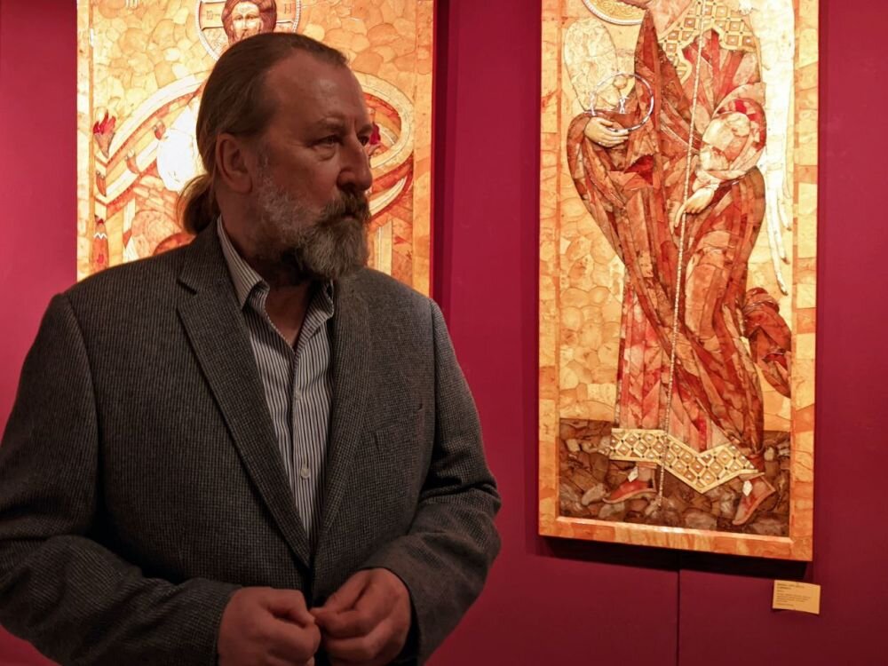 Выставка условно поделена на две части. Один зал полностью посвящён янтарным иконам Александра Крылова. Художественно они повторяют оригиналы «Троицы», иконы Божией Матери «Казанская», Николая Чудотворца и других. Но в янтаре святые образы приобретают особую выразительность и глубину.