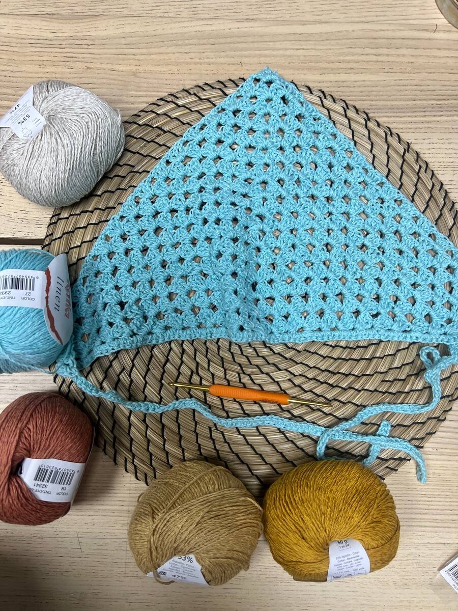 Недавно увидели классную косынку крючком на сайте одного из масс-маркетов и очень вдохновились. Связать легко, расход минимальный, а по итогу получается модный аксессуар. Решили связать и рассказать вам, как это сделать. А в нашем ТГ канале выложили кружок, как косынка смотрится на голове. Из чего связать косынку? Из материалов потребуется пряжа, крючок для вязания, ножницы, а также игла трикотажная для заправления кончиков (при желании). Пряжу можно использовать любую - с содержанием хлопка, льна, акрила. Здесь ограничений нет. По толщине можно использовать как тонкую пряжу, так и пряжу потолще. Наша косынка связана из пряжи Katia Linen (хлопок+лен), крючок № 2.3 мм от производителя Hamanaka. Как вязать косынку крючком? Делаем кольцо амигуруми, и вяжем в кольцо - столбик с накидом, 1 воздушная петля, 3 столбика с накидом, 3 воздушные петли, 3 столбика с накидом, 1 воздушная петля, 1 столбик с накидом. Затягиваем кольцо и вяжем 4 воздушные петли. 1 ряд - вяжем в первую арку три столби