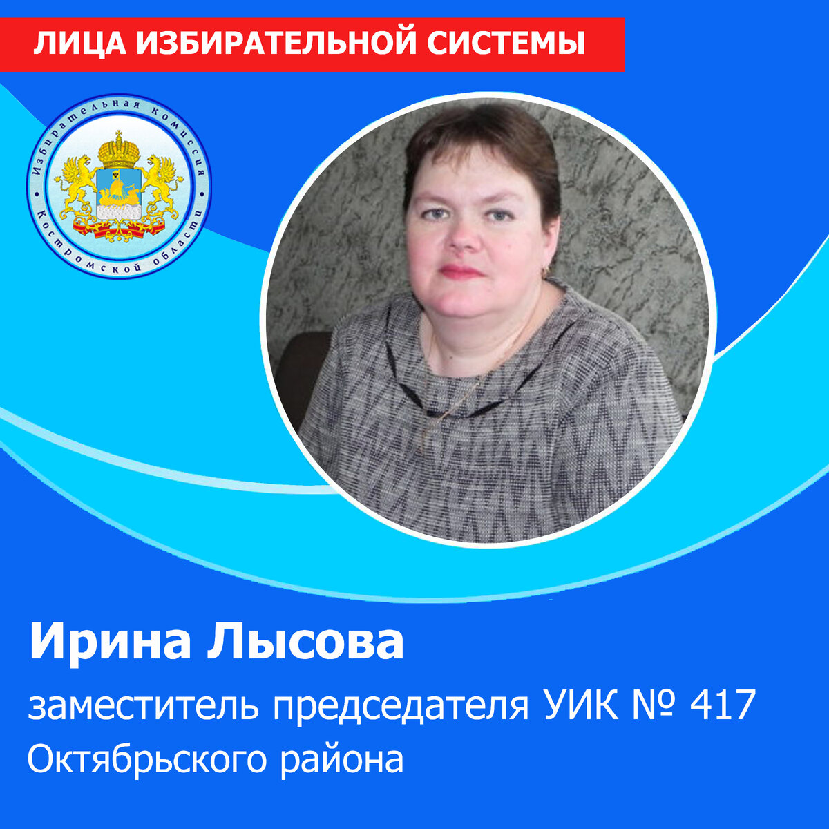 Лысова Ирина Николаевна родилась в поселке Горчуха Макарьевского района. В 1995 году окончила Шарьинский педагогический колледж по специальности «Преподавание в начальных классах». Сразу после окончания колледжа работала учителем в родном поселке. В 1996 году переехала в село Соловецкое Октябрьского района. Преподавала там в школе, затем 16 лет проработала главным бухгалтером в сельской администрации. В 2017 году Ирина Николаевна была избрана главой Соловецкого сельского поселения. После окончания срока полномочий переехала с мужем жить в село Боговарово. В настоящее время работает в администрации Октябрьского муниципального района помощником главы. В избирательной системе Ирина Николаевна 14 лет. В настоящее время является заместителем председателяучастковой избирательной комиссии № 417. В период подготовки и проведения выборов Президента Российской Федерации в рамках проекта «ИнформУИК» вела активную информационно-разъяснительную работу с избирателями. В дни голосования принимала уча