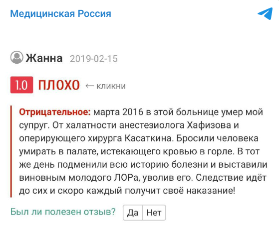 Вместе с тем, суд удовлетворил иск анестезиолога-реаниматолога ГБУЗ «Клиническая больница Святителя Луки» о защите чести, достоинства и деловой репутации и признал комментарий родственника умершего пациента порочащими сведениями.