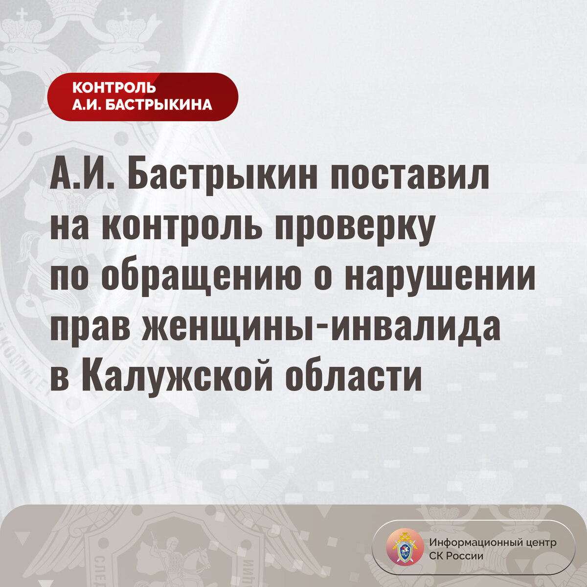 А.И. Бастрыкин поставил на контроль проверку по обращению о нарушении прав женщины-инвалида в Калужской области