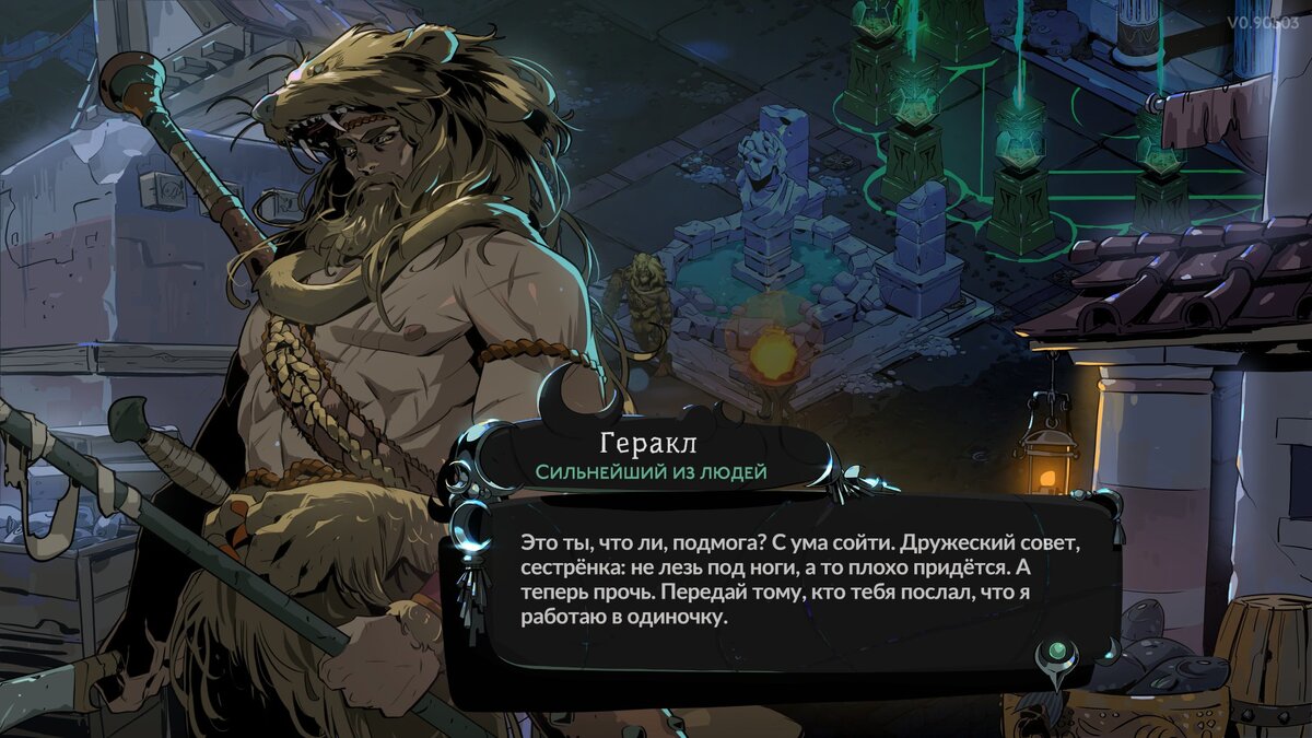 Ну а второй момент — главная героиня. Мелиное не хватает обаяния Загрея, который ходил по царству мёртвых на мрачной иронии, смешно цапался с отцом и трепал за ушком Цербера. В Мелиное слишком много пафоса и чрезмерной учтивости. Кроме Кроноса и ещё одного спойлерного персонажа она ни с кем не в контрах, хотя её саму любят не все. Пытается иногда шутить, но получается как-то вяло — даже Сцилла со своей рок-группой её затмевает. Да что уж там, слепой циклоп Полифем её затмевает! Можно долго закапываться в сравнения, но суть простая — недостаток той самой эфемерной харизмы. Хотя если бы мы не знали Загрея, может, это и не так сильно бросалось бы в глаза.