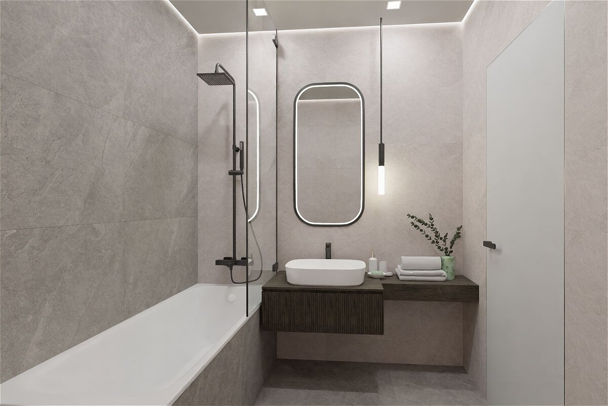 Обратите внимание на серый керамогранит, имитирующий бетон и камень. Эти актуальные текстуры не выходят из моды, при этом поверхность лучше всего выбирать матовую или структурную.