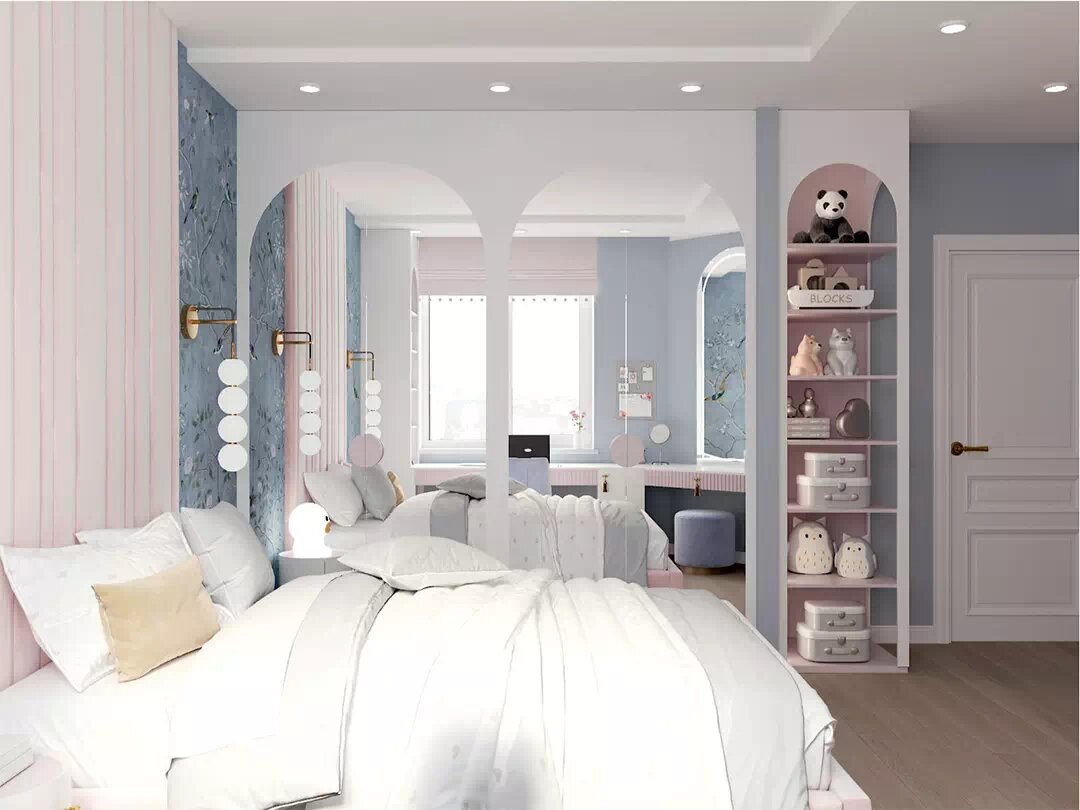 Мебель для детской комнаты девочки с уникальной реализацией системы хранения, рабочего места, зон отдыха и сна. Фото и описание тут Мебель в детскую девочки оформлена в нежных оттенках – голубом и розовом. Она идеально гармонирует с палитрой отделки стен, белым потолком, фактурой дерева в напольном покрытии. В мебельных корпусах прослеживается использование арочной формы. Справа от входа размещена комбинированная система хранения. Открытый стеллаж выполнен с фигурными вырезами в виде арок в передней части и боковине. Такие же контуры имеют зеркальные элементы четырех распашных дверец шкафа. Их дополняют полукруглые накладные ручки, соединяющиеся в круги. Подобное оформление имеет мебель для комнаты девочки, установленная вдоль одной из стен. В белоснежном корпусе – пара розовых дверок шкафа. В таком же нежно-розовом тоне представлено внутреннее пространство двух открытых стеллажей-пеналов, стеновые панели в нише, образованной их боковинами, мягкое сиденье скамьи. Место для отдыха – уют