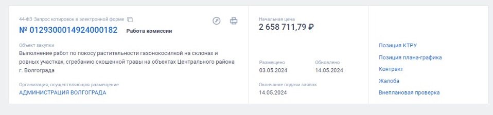 На сайте Госзакупок в начале мая была размещена закупка на поиск подрядчика, который займется покосом растительности в центре Волгограда. То есть, речь идет о газонах. Масштабный покос травы на газонах в центре города оценили в 2 658 711,79 рублей. Все это территории общего пользования. Рабочим предстоит трудиться с помощью газонокосилки и убирать за собой скошенное, то есть, сгребать кучи. В документах указан полный перечень улиц, где должны состояться такие покосы. В задачу рабочих входит выкашивание травы, сорной растительности, удаление поросли (при её наличии) газонокосилкой либо триммером. Трава должна сгребаться спустя 8 часов после проведения работ. Подрядчику во время работ стоит соблюдать осторожность, нельзя повреждать другие насаждения, ограждение и прочее. В противном случае, все это он должен будет устранить за свой счет: — Трава должна быть аккуратно выкошена, должны отсутствовать не скошенные места. Травяной покров после покоса должен быть ровным. Во время покоса травы