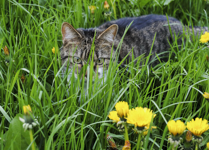 Кошка огорчилась. Кроме того, трава была мокрой от росы.