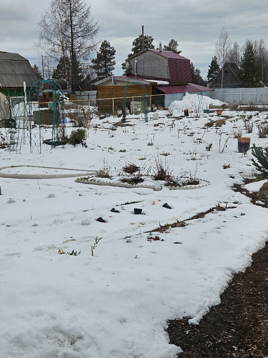 Нынешний майский ложится настом на ноябрьский. Ожидаемо ли было? И нет, и да. Суровость Севера не даёт расслабиться, позволяя себе являть кучи старого, сваленного с крыши, снега. Это сегодня, в обед, 14 мая. Нет желания, нет стремления ковырять и перебирать настовые плиты, значит - сидим в теплице, позаимствовав у супруга сапоги, да немалого размера, а к ним впридачу - штаны синтепоновые, зимние. ,,А что мы хотим?" ,,Немного солнца! Свет в оконца!" Грустно, приемлемо, обычно. Дуги в дугах, укрытия в укрытиях. А быть ли нам в печали, коли есть в руках работа. Санна прислала хороший куст дельфиниума, посадим в ведро пока. В последующем последует перевалка в грунт, когда грунт оттает ото льда. В компанию к дельфиниуму непонятную растительность в количестве одного большого и двух маленьких. Что за зверюшки, неведомо, однако сеялась хризантема ,,Платье невесты". Оно не оно, да всё равно, пусть растёт. Посадка без мороки: грунт песочный, корни в стороны, присыпка уплотнительная, мульча на