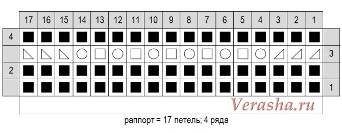 Раппорт узора: 16 петель; 10 +2 подготовительных ряда.