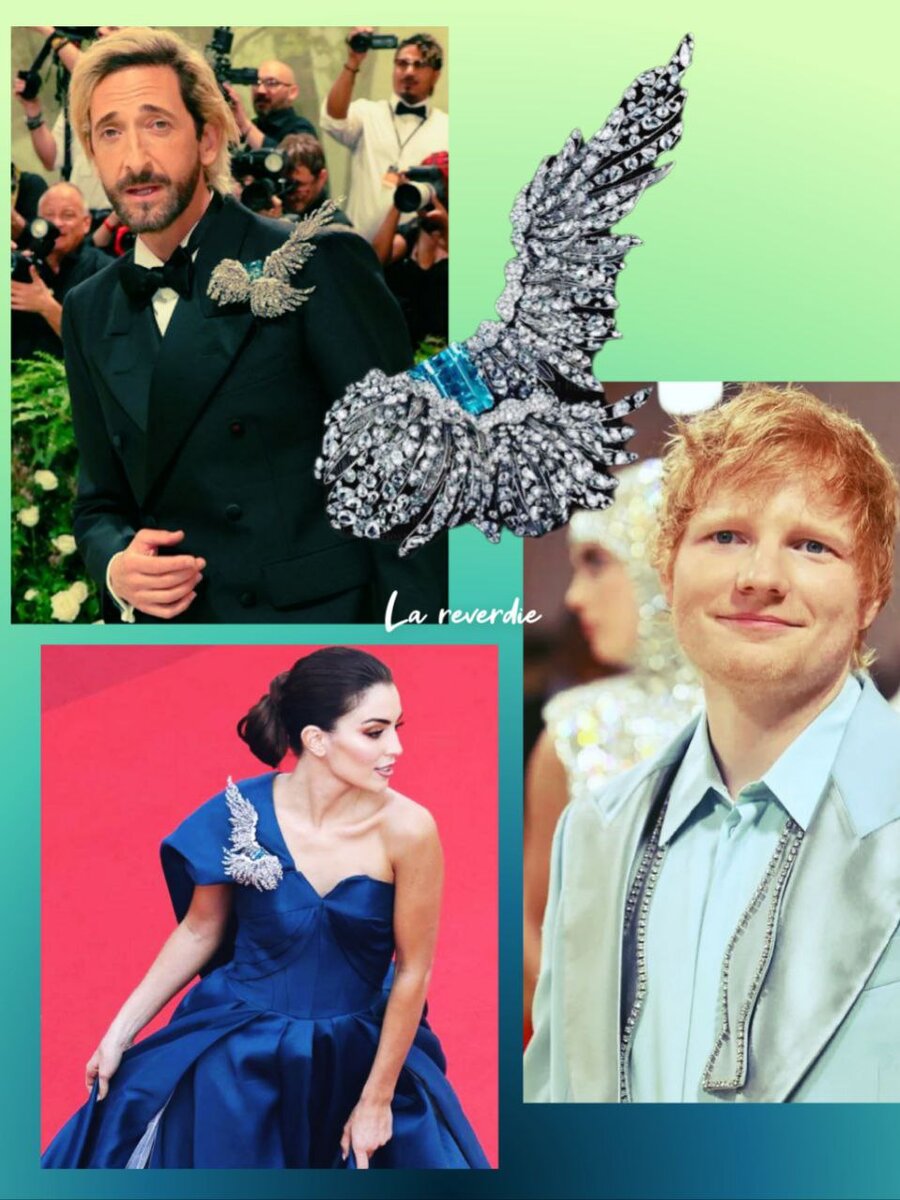Снова по-своему проявляется заглавная идея ярмарки тщеславия в этом году. Адриан Броуди носит титановую брошь Elsa Jin с 86-каратным аквамарином в центре, в окружении бесцветных бриллиантов на 200 карат. В ней же была французская модель Лара Готье на красной дорожке Канн в мае 2022 года.