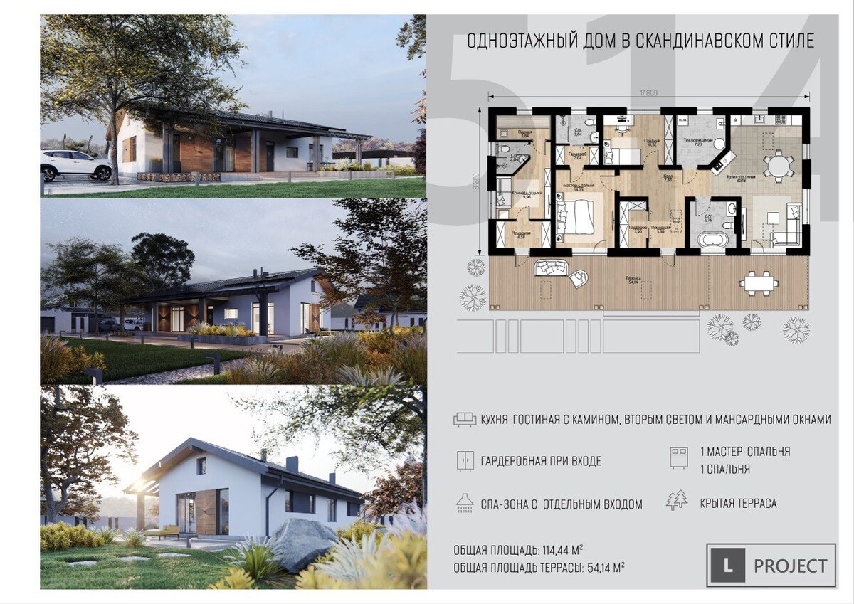 514 - Одноэтажный дом с площадью 114,44 кв с отдельной спа и банной зоной, кухней-гостиной со вторым светом и крытой террасой 📌Узнать подробнее про проект, можно написав нам в Телеграм