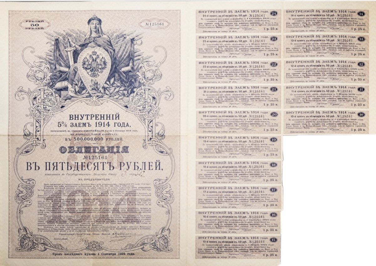 - внутренний 5% заем 1914 года, выпущенный по указу от 3 октября 1914 года на сумму в 500 млн руб. Купоны выплачивались два раза в год с 1 марта и с 1 сентября. Облигации были именными и на предъявителя.