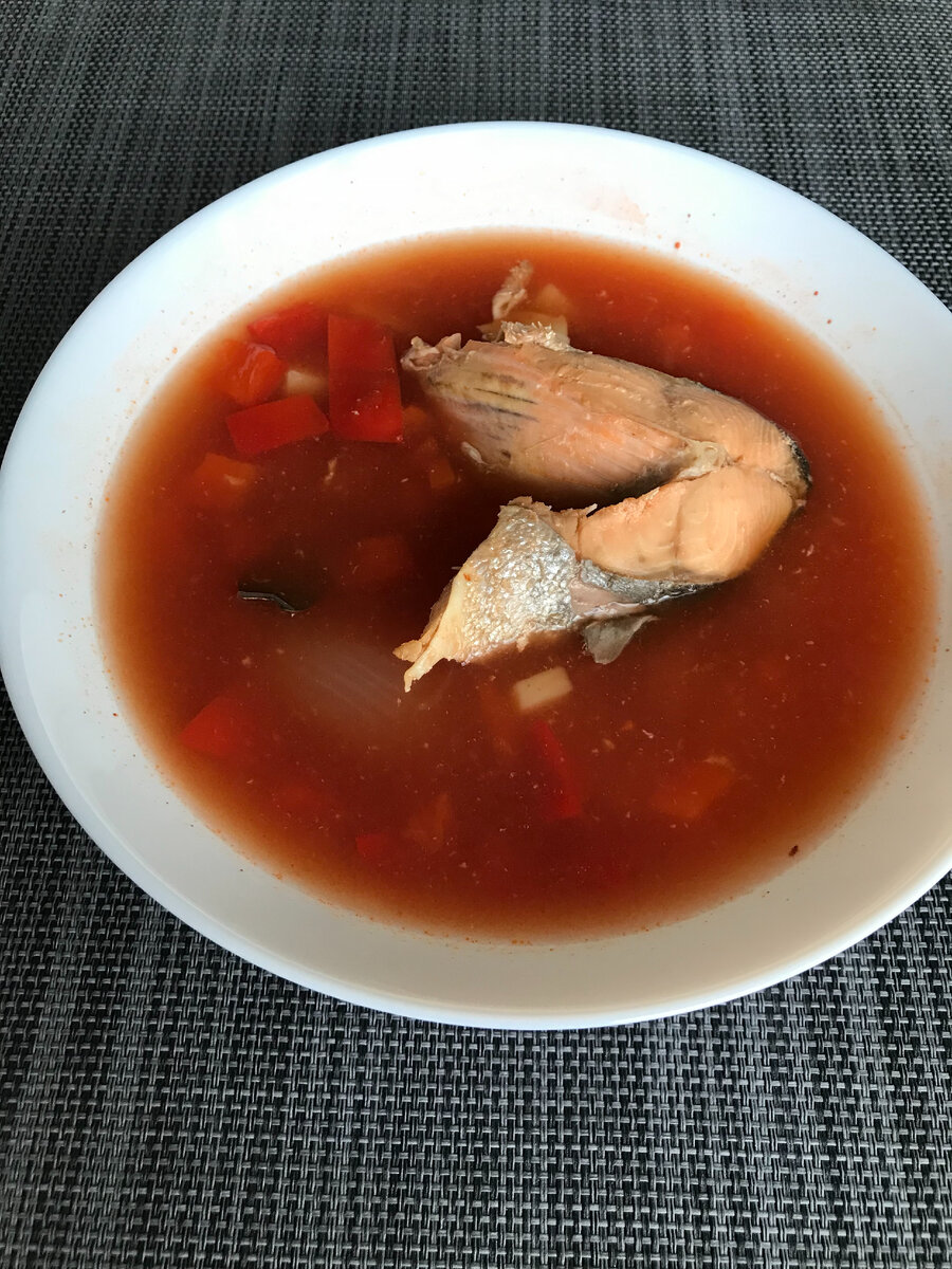 Как-то оставалось у меня три замороженных куска горбуши, а сами понимаете, что такое количество ни туда, ни сюда. Если бы на одного человека, то да, и речи не идёт, но на двоих уже несправедливо получается. Вот и решила я сварить из неё суп, а какой, сейчас расскажу. Назвала бы его 15 минуткой, но все же рыбу надо поварить немного подольше на всякий случай. Понадобятся нам на 1.5 литра супа. 1. Горбуша - можно взять баночку консервов, а так у меня было три свежих куска. 2. Картошка - 4-5 небольших клубня; 3. 1 луковица; 4. 1 морковка; 5. 0,5 - 1 шт. красного сладкого перца; 6. Томатная паста - 1 столовая ложка; 7. Лавровый лист - 2 листика; 8. Соль и перец- по вкусу. Если рыба свежая, то ее сперва надо отварить, бросаем в воду, как начинает образовываться пенка, ее снимаем. Не люблю когда в супе плавает лук, поэтому вслед за рыбой бросаю целую луковицу в воду, туда же лавровые листья. Пока рыба варится, нарезаем на мелкие кубики овощи: картошку, морковку, красный сладкий перец. К