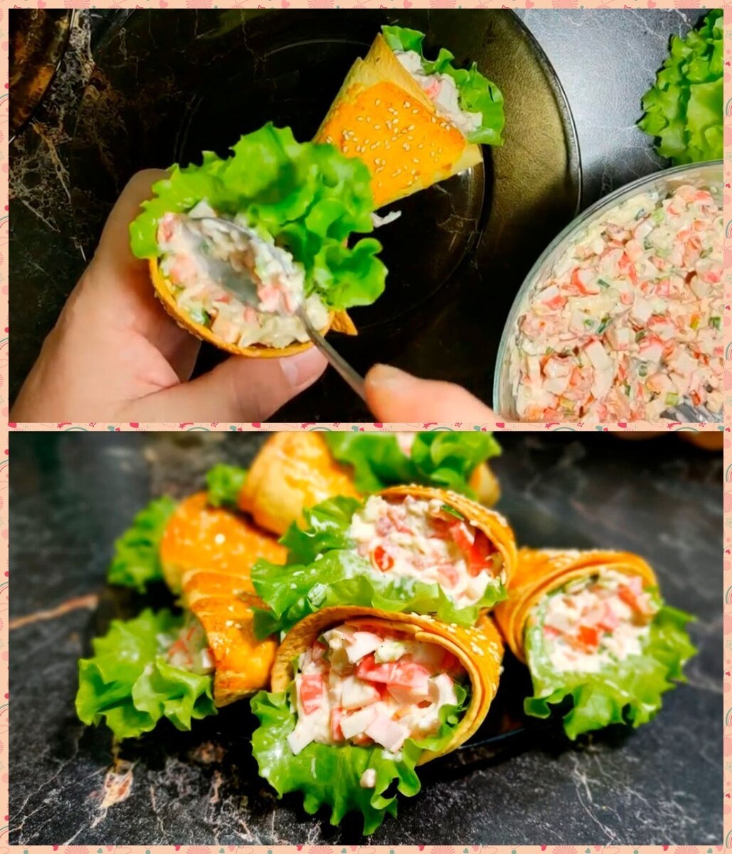 🔸Листья салата 8 шт Наш Телеграм канал https://t.me/+T6t7Ian_aD45OTE6 Как приготовить эффектную закуску из лаваша и крабовых палочек Тортилью или круглый лаваш разрезаем на два полукруга. Каждую половинку сворачиваем в виде конуса и при необходимости скрепляем зубочисткой. Заготовки из лаваша выкладываем на противень и смазываем яичным желтком. Сверху присыпаем кунжутом. Подрумяниваем конусы в разогретой до 200 °С духовке в течение 10 минут (ориентируйтесь по своей духовке). Для начинки мелко нарезаем зеленый лук. Измельчаем крабовые палочки. Помидоры нарезаем небольшим кубиком. Сыр натираем на мелкой терке. Подготовленные ингредиенты заправляем 2-3 столовыми ложками сметаны. Солим и перчим по вкусу и п
