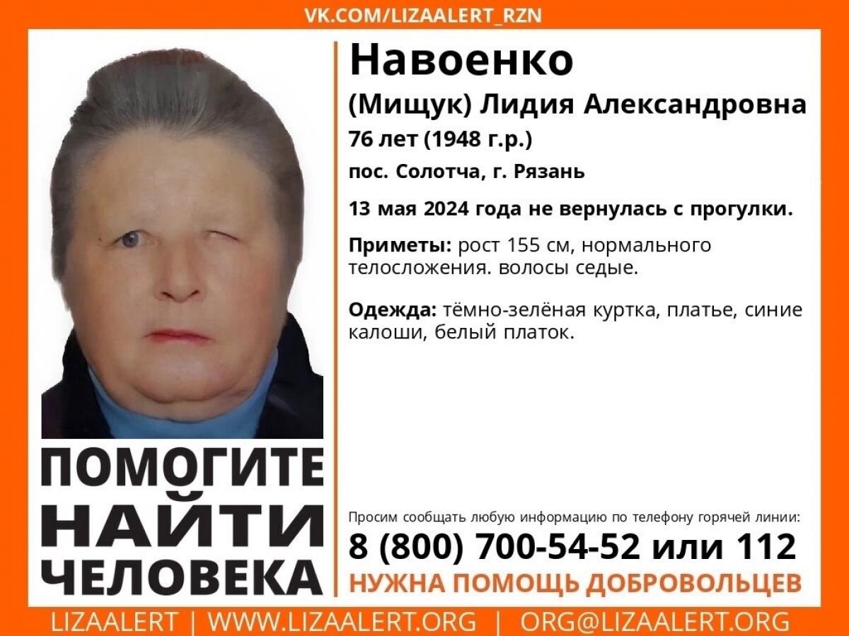 В Рязани волонтеры ищут добровольцев для поисков пропавшей 76-летней Лидии Навоенко. Об этом сообщает ПСО «ЛизаАлертРязань». 13 мая после обеда женщина вышла погулять на придомовую территорию и пропала. Позже выяснилось, что забор у дома был сломан в одном месте, видимо через него и вышла пенсионерка. Вчера в ночь на поиски женщины выезжали 13 человек от «ЛизаАлерт», в том числе три кинологических расчета. Также поисками занимались девять добровольцев МСО РязГМУ «Salus» им. В.И. Васильева, поисковики отряда «Мещера», сотрудники полиции с кинологическим расчетом. Волонтерами и полицией было пройдено более 120 километров. Но женщину до сих пор не удалось найти. Лидии Александровна нуждается в медицинской помощи и сама не сможет вернуться домой. Сегодня волонтеры вновь отправятся на поиски пропавшей. Для помощи им требуются ещё люди. Всех, кто готов присоединится к поискам просят писать в соцсети. Напомним, ранее сотрудники поискового отряда сообщили приметы пропавшей Лидии Навоенко, сре