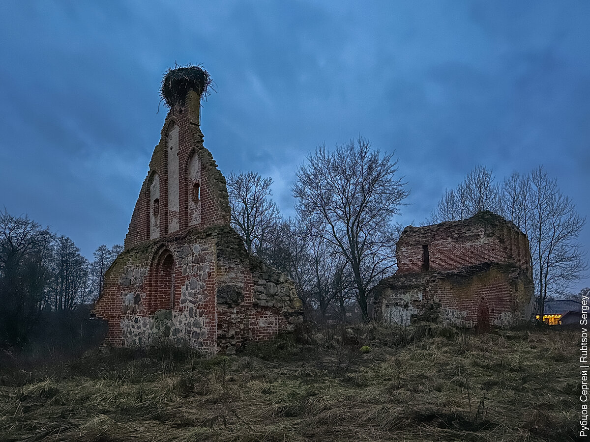 Последняя точка третьего дня нашего путешествия по Калининградской области расположилась в поселке Яблонево, куда мы прибыли уже в сумерках. Из потемок на нас выглядывают руины кирхи Лихтенхагена. Кирха середины 14-го века, представляла собой квадратную башню, сложенную готической кладкой из кирпича и булыжника, высокого прямоугольного нефа и узкого алтаря. В 1853 году внутри был установлен орган. Во время боев 1945 года здание кирхи сильно повредили, разрушив часть башни и крышу. Разумеется, в послевоенные года никто не стал заниматься ее восстановление, накрыли остатки шифером, заложили лишние входы и приспособили для хозяйственных нужд. С 1993 года кирха начала активно разрушаться, пока не предстала перед нами в таком виде. Самое интересное, что несмотря на удручающий внешний вид, на стенах внутри можно найти несколько старинных надписей на немецком языке. Координаты: 54.603830, 20.435082 На этом очередной день нашего путешествия подошел к концу, она выдался не таким насыщенным, ка