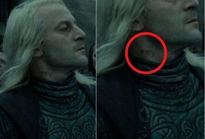 9 ДЕТАЛЕЙ ИЗ ГАРРИ ПОТТЕРА, КОТОРЫЕ НЕ ЗАМЕТИЛИ ДАЖЕ ФАНАТЫ В 2001 году мир впервые увидел сказочный фильм о мальчике-волшебнике, который тут же обрёл невиданный успех, как среди детей, так и среди взрослых. Со временем вышла целая серия фильмов о Гарри Поттере, насчитывающая 8 кинолент о знаменитом волшебнике, которые были сняты по романам английской писательницы Джоан Роулинг. «Гарри Поттер» завоевал миллионы сердец по всему миру, влюбив в себя до беспамятства бесчисленную армию людей, но даже люди, считающие себя фанатами этого фильма, не могут знать всё. В «Дарах Смерти» у Малфоя-старшего на шее появляется татуировка. Это номер заключенного в Азкабане В одной из сцен в Большом зале на столе факультета Когтевран можно заметить хлопья для завтрака — «Cheeri Owls», это аллюзия на известные американские хлопья «Cheerios», только с уклоном в магическо-совиную тематику Когда Дамблдор впервые навещает Тома Реддла в его комнате в приюте, можно заметить семь камушков, олицетворяющих семь бу