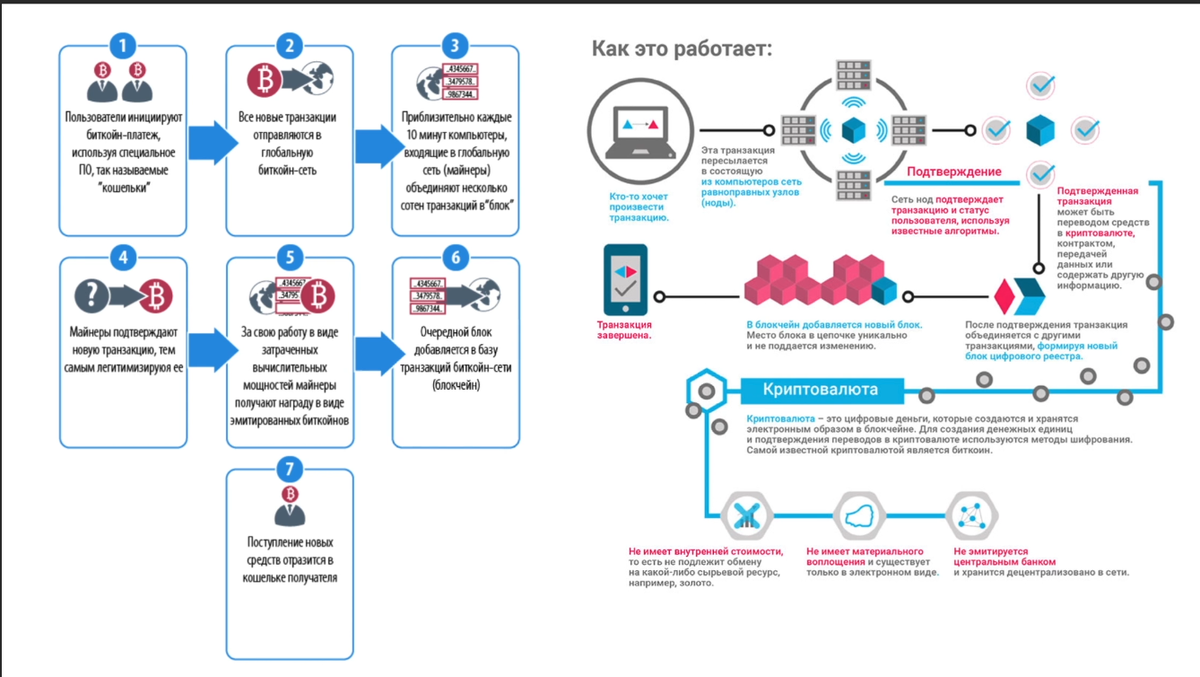 Блокчейн -с английского block chain – что переводится как цепочка блоков -технология хранения данных на огромном множестве распределенных по всему миру компьютеров, где содержится информация, которую невозможно изменить или перезаписать – эта информация защищена криптографически- с использованием методов шифрования. И на каждом компьютере участвующем в процессе хранится копия этой базы данных. Идеи и предложения подобных систем существуют давно- но лишь в 2008 году некий разработчик или группа под псевдонимом Сатоши Накамото запустило проект, который называется Bitcoin, который являлся реализацией этой технологии. Преимущества распределенного реестра перед централизованным очевидны -информацию в этой базе данных невозможно перезаписать или подделать -потому что подлинность данных проверяется миллионами компьютеров по всему миру. Это очень удобно и имеет блестящие перспективы в будущем -такими как например наследственное право, любые сделки. Когда доверие участников рынка будет достато