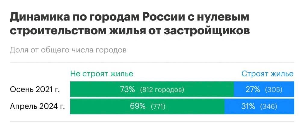 К апрелю 2024 года число городов, где ведётся строительство жилья профессиональными застройщиками, выросло на 41 и составило 346 городов (30,9 %) из 1117 существующих, — РАСК Сильнее всего с 2021 года активизировалось строительство в 89 городах. Среди крупнейших — Петропавловск-Камчатский, Черкесск, Жуковский (Московская область), Березовский (Свердловская область) и Хасавюрт. При этом есть и города, в которых строительство упало до нуля. Это 48 городов, крупнейшие среди них — Звенигород (Московская область), Богородск (Нижегородская область), Подпорожье (Ленинградская область), Лосино-Петровский (Московская область) и Клин (Московская область) Придумай описание к стать