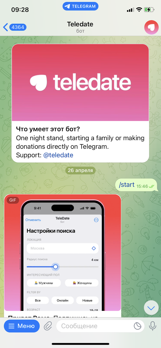 Недавно обсуждали с подругой, как стало сложно знакомиться в сети после ухода приложений для знакомств из России. Осталось лишь несколько хороших сервисов, но и там нелегко найти приятного человека для общения и свиданий. Вместе решили поискать что-то, что будет по душе, и наткнулись на Teledate. Teledate — приложение для знакомств в Telegram. Сразу понравилось, что не нужно скачивать очередное приложение на телефон: запустить Teledate можно через чат-бота в мессенджере. Вот ссылка на чат-бота, если кому-то нужно. Думала, что будет долго и сложно: пройти регистрацию, заполнить анкету и разобраться в интерфейсе приложения, но все оказалось иначе. Открыла чат-бот, нажала «/start» и сразу попала в мир знакомств. Сначала заполнила короткую анкету о себе — это заняло пару минут, а не полчаса, как в других приложениях для знакомств. Добавила несколько фото, придумала короткое описание и выбрала дату рождения. Заметила, что приложение очень простое и состоит из нескольких разделов, поэтому в