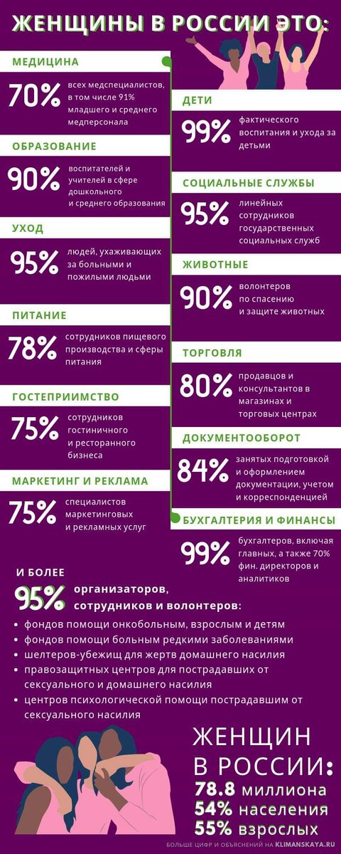 Женщины, будучи ограничены списком запрещенных профессий из 456 специальностей, находятся в ситуации нездоровой конкуренции в доступных им отраслях, которая приводит к низкому уровню оплаты труда и огромной скрытой безработице (неполный день, неполная неделя, полставки и т.д.), даже для наиболее квалифицированных специалистов. При том, что общий уровень образования у женщин выше — их рынок труда меньше мужского на более чем 10 миллионов рабочих мест, что в итоге приводит к финансовой зависимости многих миллионов женщин от их мужей, отцов, сыновей. Нужна ликвидация списка запрещенных профессий, и это не говоря о стеклянном потолке и саботаже в образовании. Я ТРЕБУЮ ОТМЕНИТЬ СПИСОК ЗАПРЕЩЕННЫХ ПРОФЕССИЙ!