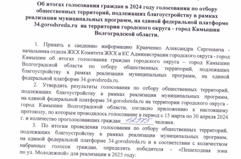 На днях был подписан протокол заседания комиссии по подведению итогов голосования по выбору общественной территории, подлежащей благоустройству в Камышине в 2025 году. Председательствовал глава города Станислав Зинченко. Как сообщает ИНФОКАМ со ссылкой на документ, всего за три предложенные территории проголосовало 12 575 человек. Из них 5158 человек отдали голос за благоустройство участка улицы Молодёжной на 2-м участке. Здесь обустроят пешеходные дорожки из тротуарной плитки, установят систему освещения и малые архитектурные формы (скамейки, урны). Также предусматривается озеленение.