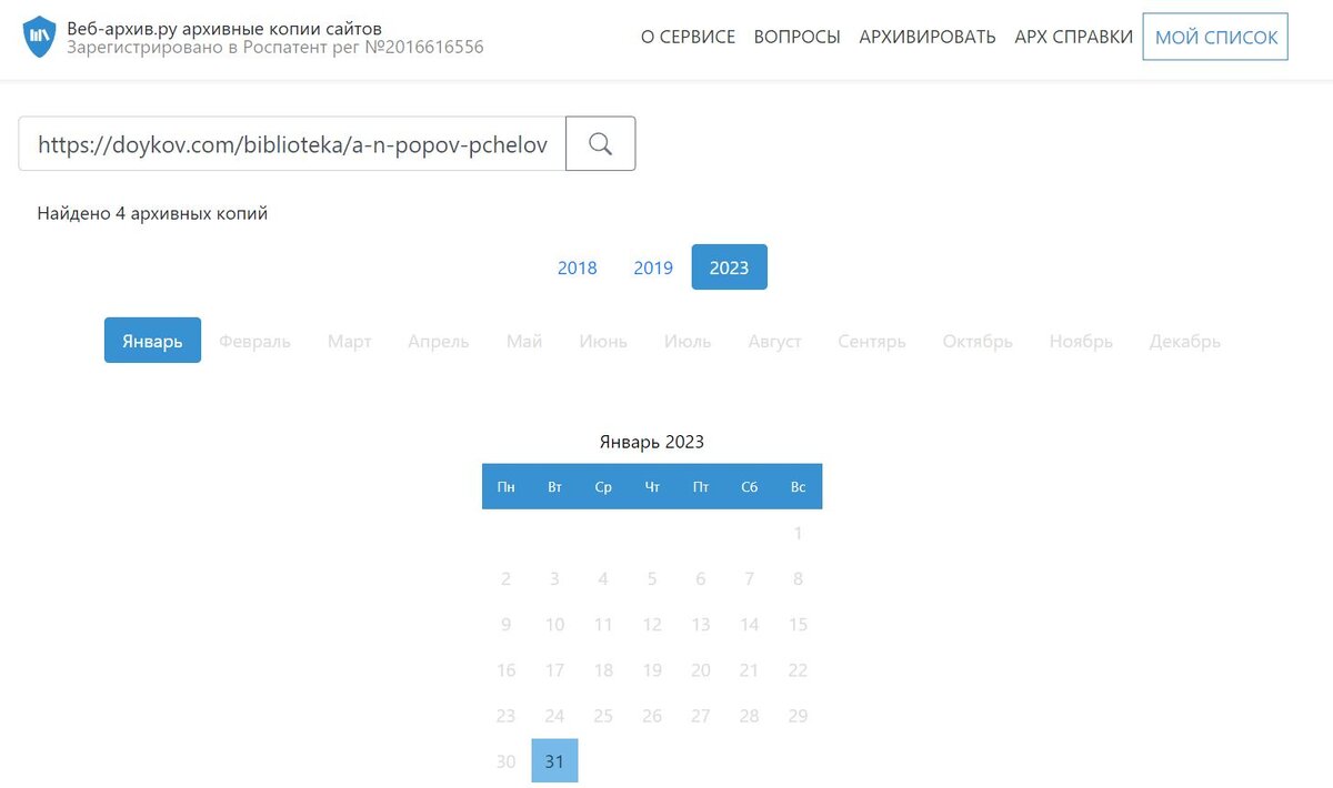 Иногда, когда натыкаюсь на интересныую страницу в интернете, исходя из идеи снова на нее зайти и почитать, сохраняю ее в закладках. Как, например, со скрином статьи про Архангельское пчеловодство. Решил значит вернуться на страницу, освежить память, а она заблокирована. Выдает сообщение о небезопасности и переводит на разную рекламу с предложением подключить платные услуги. Очевидно или сайт заблокирован или неоплатил вовремя аренду, или страница удалена. Казалось бы страница безвозвратно потеряна. Но интернет все помнит. Есть несколько ресурсов, которые хранят архив старых страниц со всего интернета. Причем иногда достаточно старых. Находил с 2000 года сохраненные версии. Российский вариант называется веб-архив. Функционирует он следующим образом: копируешь необходимую ссылку в окошко поиска. И сайт выдает версии обновления страницы. Для моей нашлось 4 архивных копии разных лет. Очевидно когда что-то менялось на указанной странице. Выбираем подходящую: Ссылки внутри архивной страни