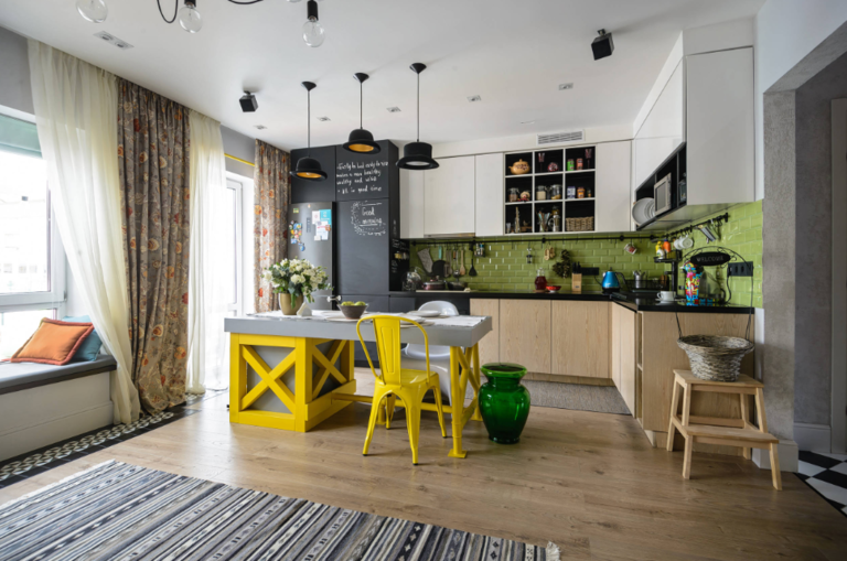 При выборе цвета для кухни, совмещенной с гостиной, стоит принять во внимание: Последний пункт кто-то отнесет к разряду эзотерики, но это не так. Если вы уже определились со стилем интерьера, пусть он вам и укажет на нужные сочетания. Для классики это – пастельные, нежные оттенки, разбавленные темно-коричневым или черным в меньшинстве. Прованс любит сочетать мягкие голубые, розовые и светло-зеленые оттенки с деревом. Скандинавский стиль - это сочетание белого, серого и дерева. В стиле кантри присутствуют национальные цвета. Ар-деко оформлен в черно-белых, иногда бежево-коричневых или серебристо-черных тонах. Есть правила подбора цветов, связанные скорее не со стилем, а с пропорциями и количеством цветов, и вот они: 1. 60х30х10 – это цветовая гармония. 60% пространства принадлежат основному цвету (отделке стен, мягкой мебели), 30 – дополнительному (фасады мебели), а 10% стоит посвятить акцентам. 2. Уравновешенный в цветовом плане интерьер представлен одним-двумя основными цветами и таки