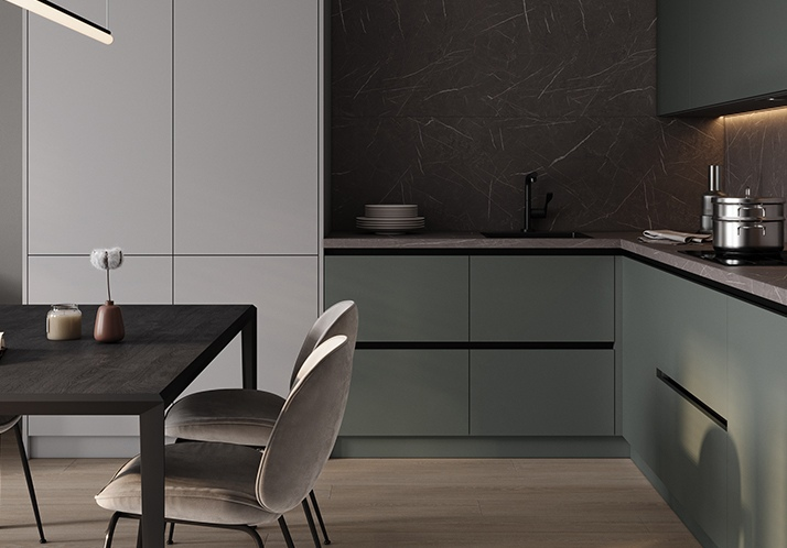 Покупатели ценят их за стильный внешний вид, прочность и долговечность. Этот материал обладает устойчивостью к влаге, царапинам и другим повреждениям, что обеспечивает долгий срок службы кухни. Поверхность SUPRAMAT имеет специальное покрытие, которое делает ее очень приятной на ощупь и устойчивой к загрязнениям. Благодаря этому, уход за такой кухней становится простым и удобным.