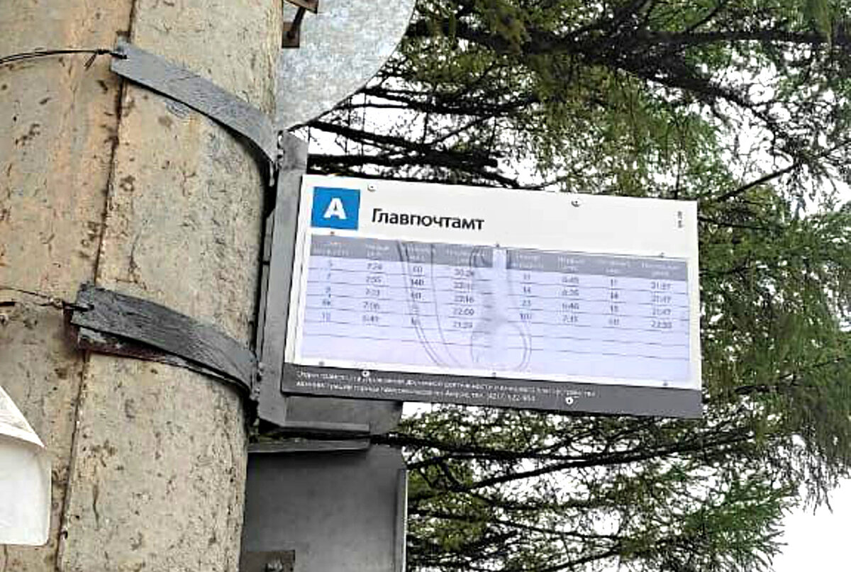 Очевидно, более поздняя табличка всё того же ПАТП на остановке «Площадь Кирова», потому что время окончания работы слишком раннее. И ради того, чтобы сделать надписи крупно, использовали две. Понимали, что иначе в них смысла нет. Грубо, но практично.