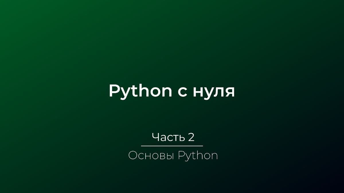 Первая программа Создадим нашу первую программу, которая выводит "Hello, World!" на экран. Переменные и типы данных. В Python вам не нужно явно объявлять тип переменной. Давайте рассмотрим основные типы данных и как их использовать. Числа a = 10 b = -5 Числа с плавающей точкой c = 3.14 d = -2.7 Строки Одиночные и двойные кавычки s1 = 'Hello' s2 = "World" Многострочные строки s3 = """Это многострочная строка""" Логические значения t = True f = False Операции с переменными Арифметические операции x = 10 y = 3 print(x + y) # Сложение print(x - y) # Вычитание print(x * y) # Умножение print(x / y) # Деление print(x // y) # Целочисленное деление print(x % y) # Остаток от деления print(x ** y) # Возведение в степень Операции со строками str1 = "Hello" str2 = "World" # Конкатенация строк print(str1 + " " + str2) # Повторение строки print(str1 * 3) Ввод данных Часто в программах нужно получать данные от пользователя. Для этого в Python используется функция input(). name = input("Введите ва