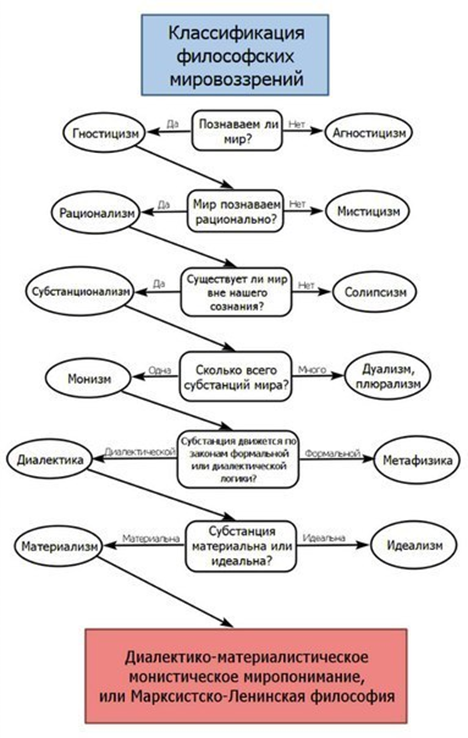 Это не классификация! Здесь нарушены все законы логики и всё поставлено с ног на голову. Начинать с вопроса «познаваем ли мир?», когда не известно, что есть мир – глупость. Гносеология впереди онтологии. Это уже идеализм, а скорее идиотизм.